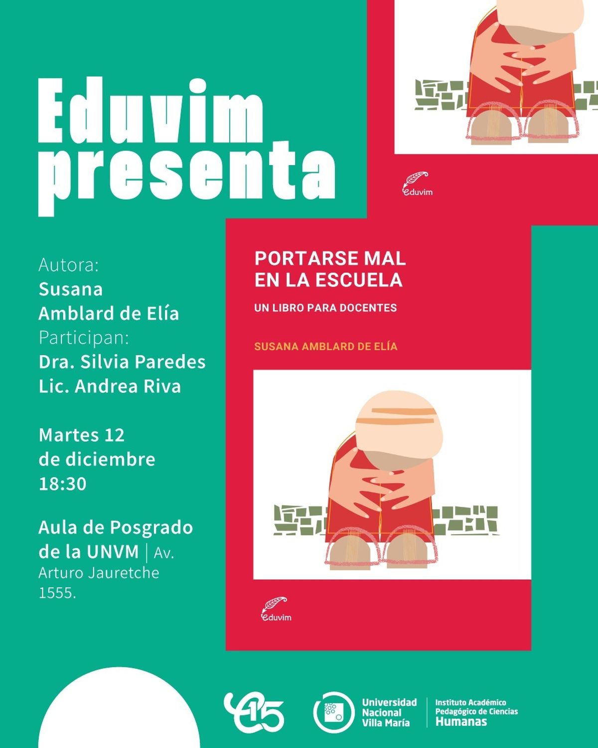 Desde el Instituto de Ciencias Humanas y la Editorial Universitaria de la Universidad Nacional de Villa María (EDUVIM) realizarán la presentación del libro “Portarse mal en la escuela. Un libro para docentes” de Susana Amblard de Elia, el próximo martes 12 de diciembre a las 18:30 hs en el aula de posgrado del Campus Universitario (Arturo Jauretche 1555).