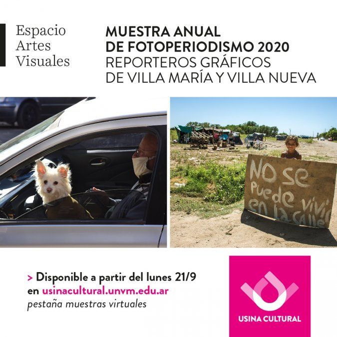A partir del lunes 21 de septiembre y de manera permanente, se puede recorrer una nueva muestra en la web de la Usina Cultural (UC). Se trata de la "Muestra anual de fotoperiodismo 2020" de reporteros gráficos de Villa María y Villa Nueva, un grupo integrado por María Victoria Araujo, Martín Llampayas, Gonzalo Vega, Roberto Zayas y Daniel Albornoz.