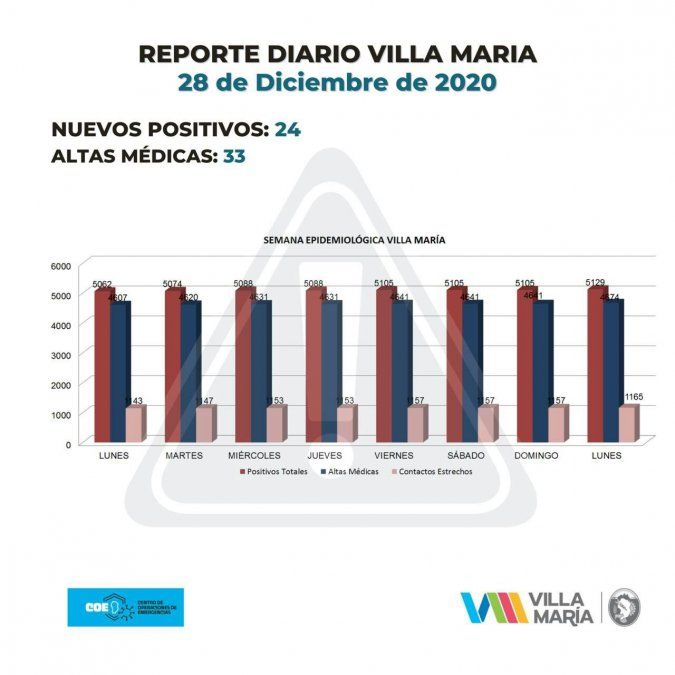 Las autoridades de Villa María, brindaron el reporte sanitario correspondiente a las últimas 72 hs. La ciudad sumó 24 nuevos contagios por Covid-19 y 33 altas médicas definitivas.