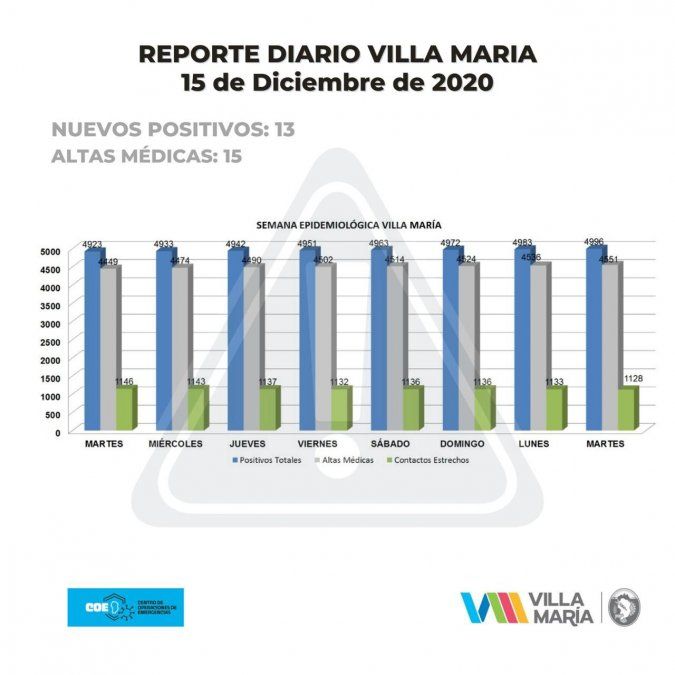Villa María reportó este martes, 13 contagios y 15 altas médicas definitivas. Las autoridades sanitarias actualizaron los datos e indicaron que la ciudad cuenta con 347 casos activos.