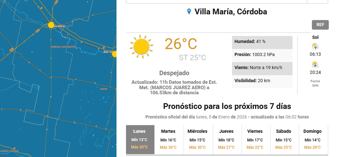 Durante la mañana, el termómetro se ubica en torno a los 20°C, mientras que por la tarde se espera el pico térmico, acompañado por viento del sector norte, con ráfagas que podrían superar los 40 km/h. Hacia la noche, las condiciones se mantendrán estables, con una temperatura cercana a los 23 grados y sin probabilidad de precipitaciones.