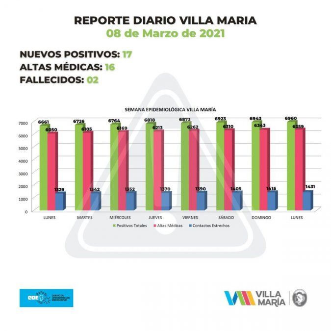 Villa María confirmó 17 nuevos contagios por Covid-19. Las altas médicas brindadas en las últimas 24 horas, fueron 16.