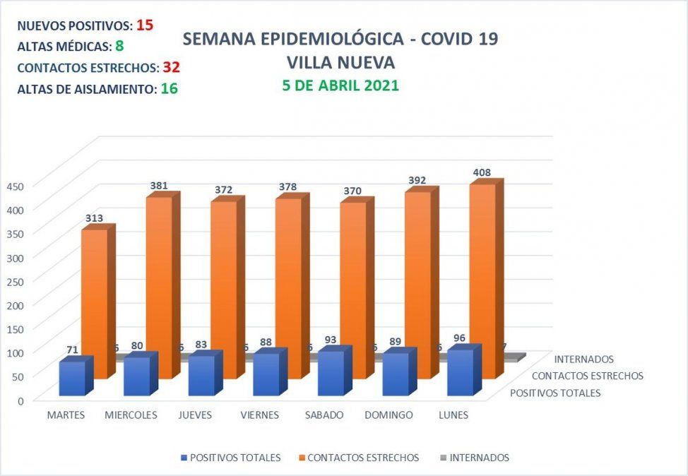 En las últimas 24 horas se registraron 15 casos positivos de Covid-19 en Villa Nueva, en tanto que se otorgaron 8 altas médicas y 16 altas de aislamiento. En la jornada, además se aisló a 32 personas por ser contactos estrechos.