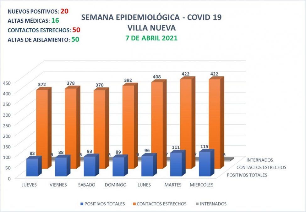 En las últimas 24 horas se registraron 20 casos positivos de Covid-19 en Villa Nueva. Además, se otorgaron 16 altas médicas y 50 altas de aislamiento. Del mismo modo, se aisló a 50 personas por ser contactos estrechos.