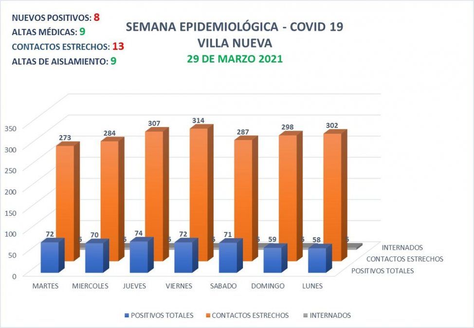 En las últimas 24 horas, se registraron 8 casos positivos de Covid-19 en Villa Nueva, en tanto que se otorgaron 9 altas médicas y 9 altas de aislamiento. Se aisló a 13 personas por ser contactos estrechos, y se otorgaron.