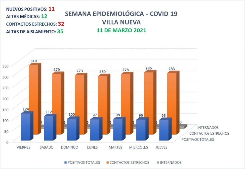 En las últimas 24 horas, en Villa Nueva se registraron 11 casos positivos de Covid-19, se brindaron 12 altas médicas y 35 altas de aislamiento. En la jornada, se aisló a 32 personas por ser contactos estrechos.