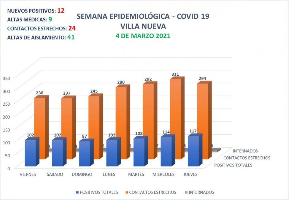 Desde el inicio de la pandemia, en Villa Nueva se contabilizan 1701 casos de Covid-19. La cantidad de contactos estrechos actualmente es de 294 personas.