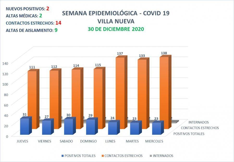 En las últimas 24 horas se registraron 2 casos positivos de Coronavirus en Villa Nueva, en tanto que se registraron 2 altas médicas y 9 altas de aislamiento. La cantidad de contactos estrechos actualmente es de 138 personas.