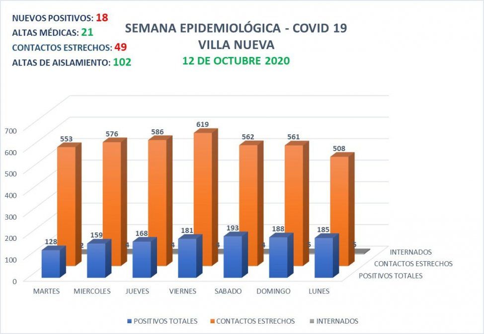 Las autoridades de la vecina ciudad de Villa Nueva, informaron 18 nuevos positivos a coronavirus. Además, reportaron 21 altas médicas y 102 altas de aislamiento. Unas 49 personas fueron aisladas.