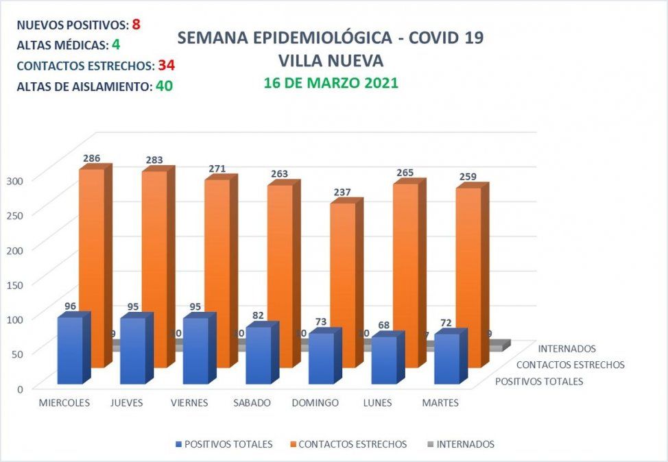 En las últimas 24 horas se registraron 8 casos positivos de Coronavirus en Villa Nueva, en tanto que se otorgaron 4 altas médicas y 40 altas de aislamiento. En la ciudad, se aisló a 34 personas por ser contactos estrechos.