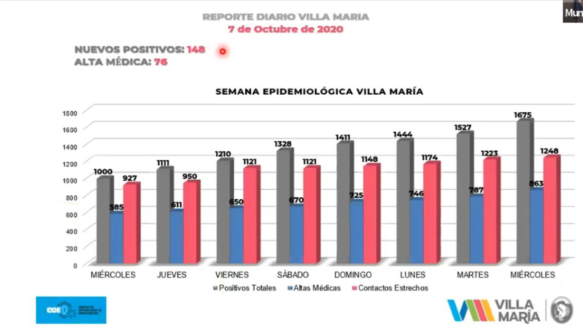 El Municipio de Villa María y el COE local informaron 148 nuevos casos de coronavirus en la ciudad. En el reporte epidemiológico correspondiente a este miércoles, además registraron 76 altas médicas definitivas.