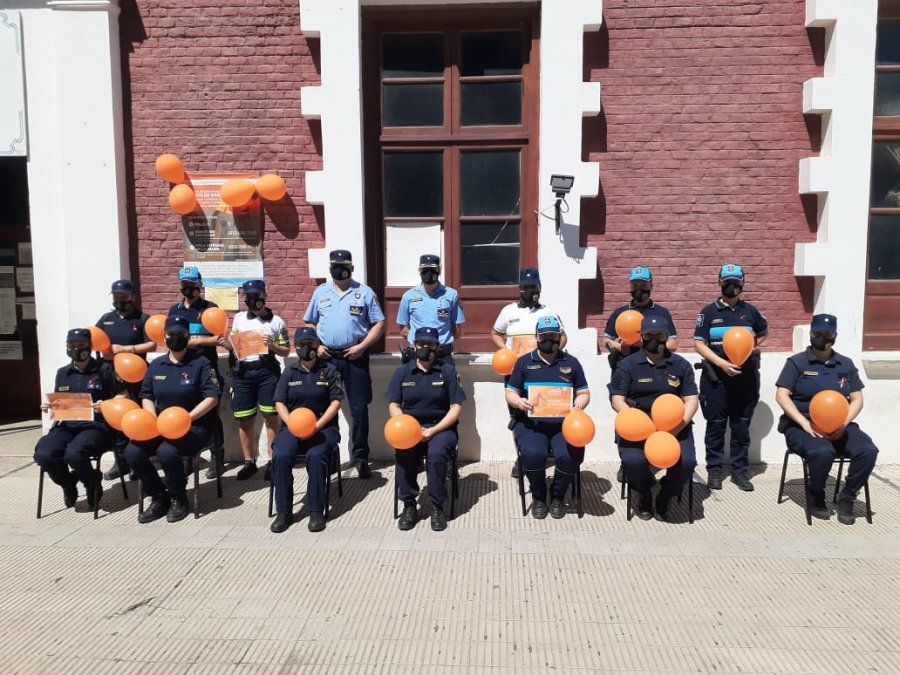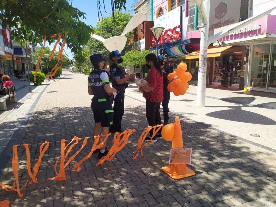 A nivel local, las uniformadas de la fuerza de seguridad provincial recorrieron diferentes espacios del microcentro local haciendo entrega de distintivos de color naranja.