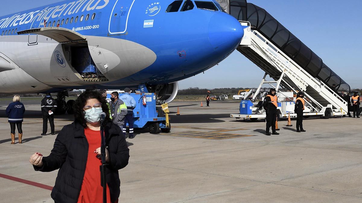Así lo indicó en declaraciones a la prensa al arribar esta mañana al aeropuerto de Ezeiza. El vuelo de Aerolíneas Argentinas aterrizó a las 9,43 con un cargamento de 650.000 dosis de vacuna Sputnik -400.000 correspondientes al componente 1 y 250.000 al componente 2- y 500 litros de la sustancia activa para su fabricación en el laboratorio local de Richmond.